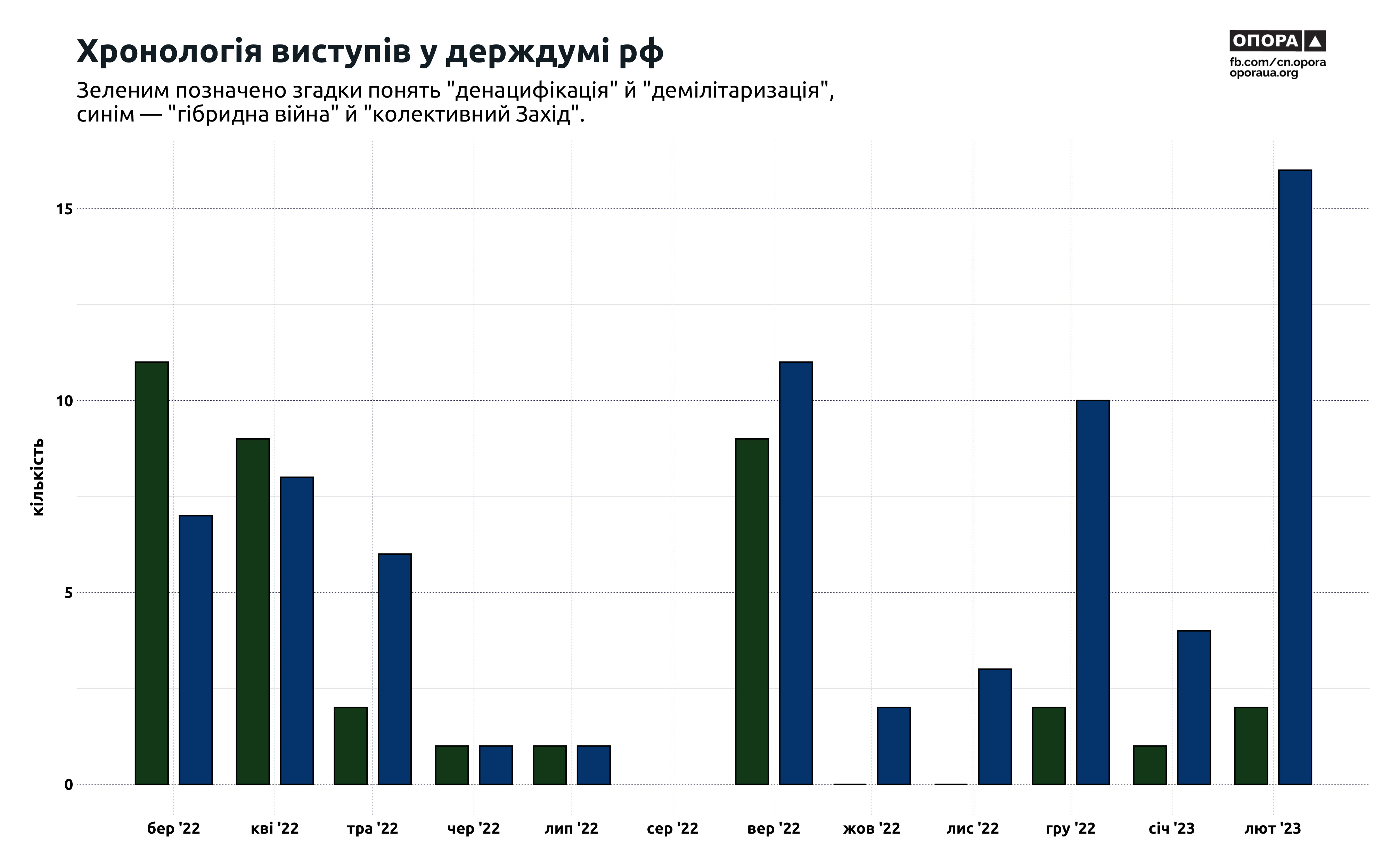 У попередньому матеріалі ОПОРА вже писала, що держдума рф буквально одержима Україною — з 1 січня 2014 року в стенограмах засідань цього органу нашу країну згадували понад 7 тисяч разів. Натомість у цьому блозі ми дослідили конкретні наративи, які звучали у стінах держдуми з початку повномасштабного вторгнення росії. Крім того, нас цікавило, чи продукували російські депутати власні пропагандистські концепції щодо агресії проти України.