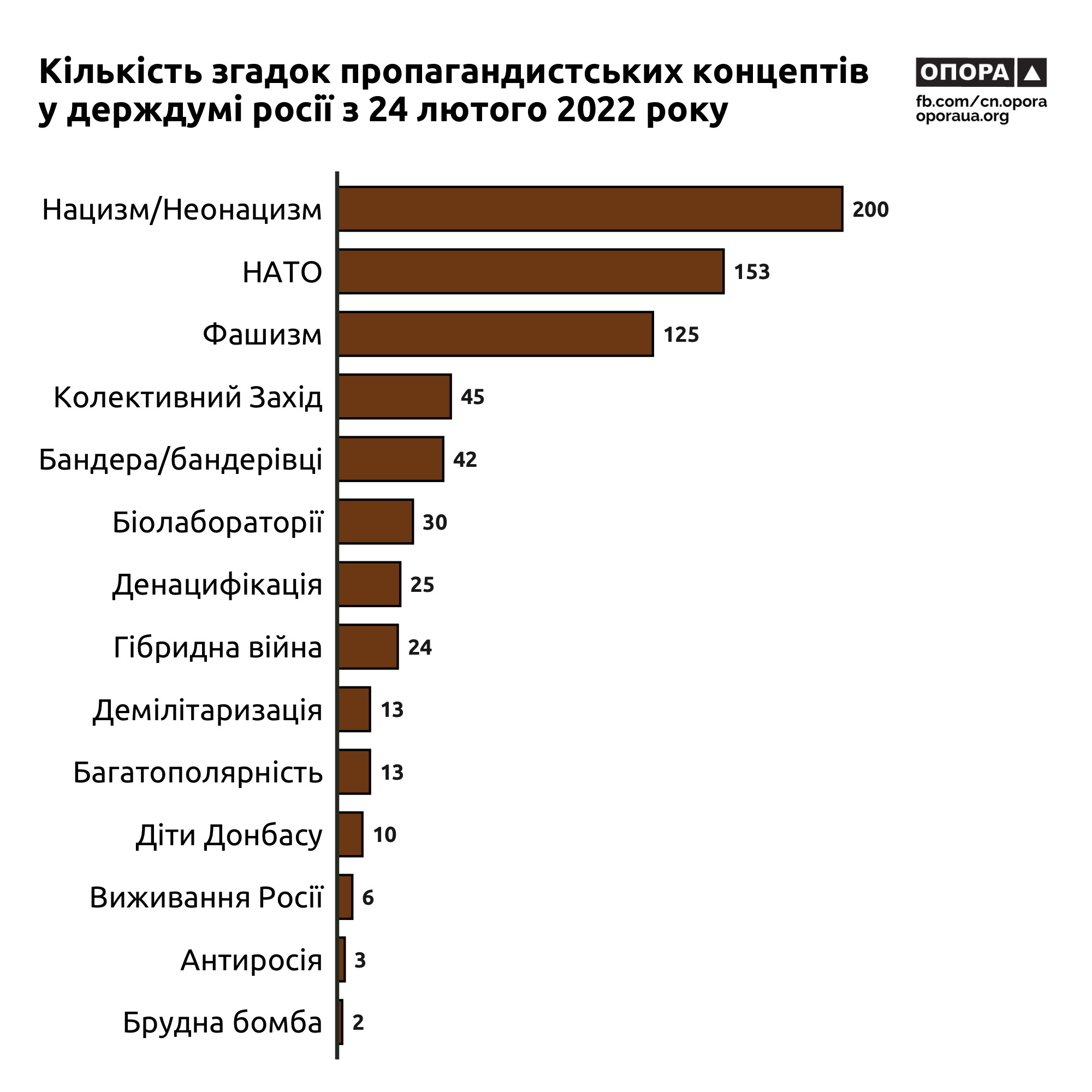 Втім, про все за порядком. Передовсім ми виявили, що найчастіше вживаними концептами у стінах Держдуми стали "нацизм" та "фашизм" — сумарно ці терміни згадали понад 300 разів. Причому говорили про них майже постійно — під час понад 73% засідань.