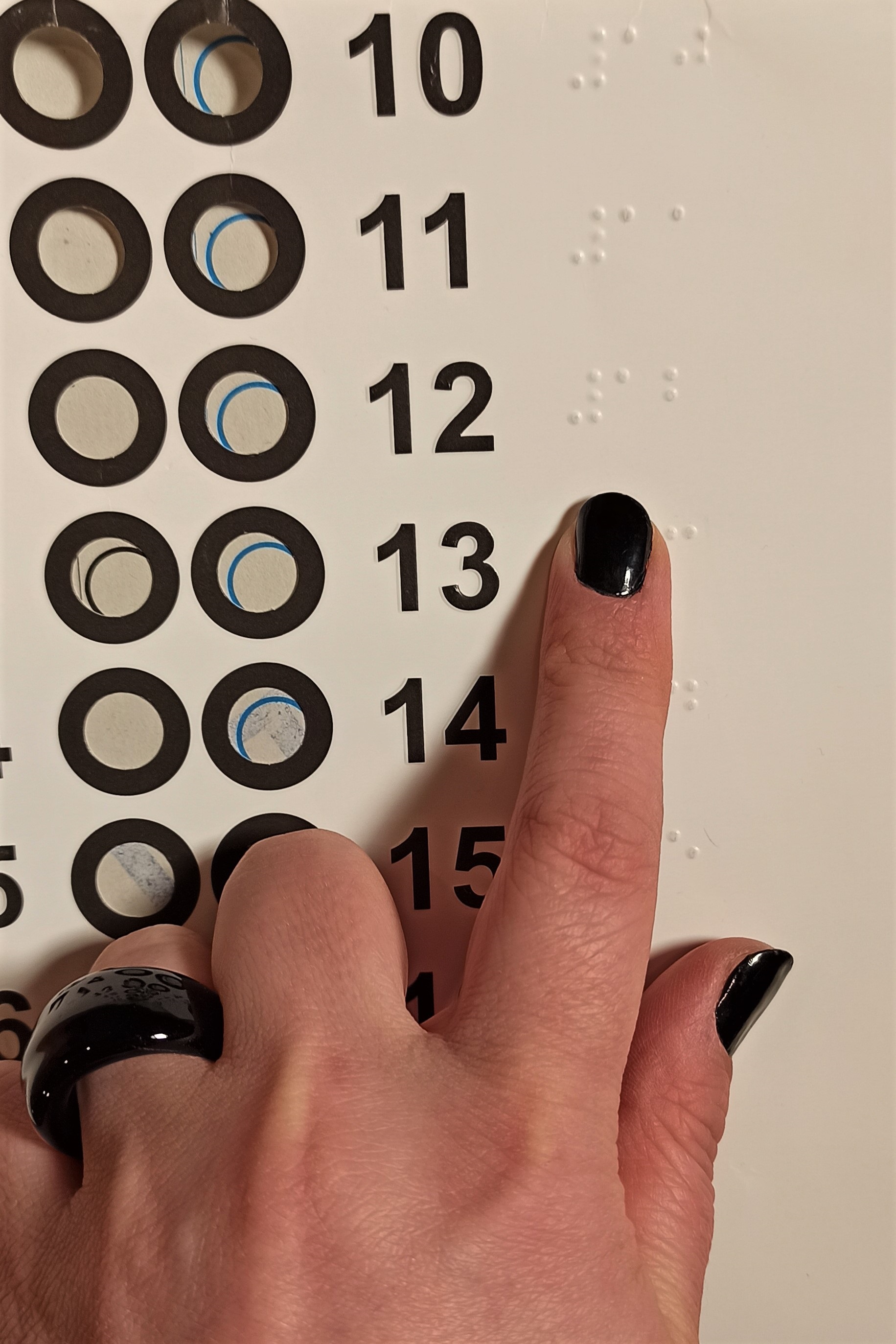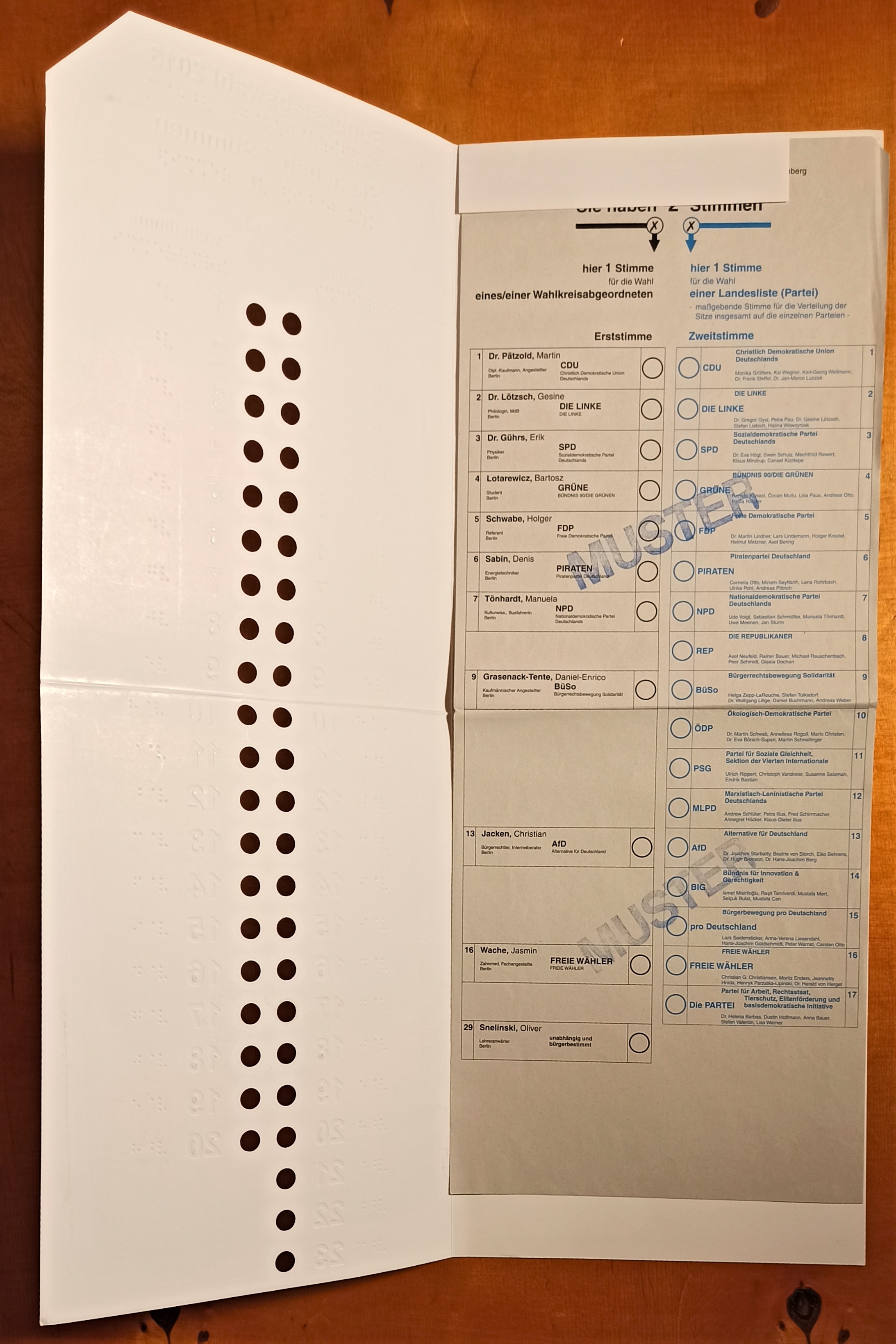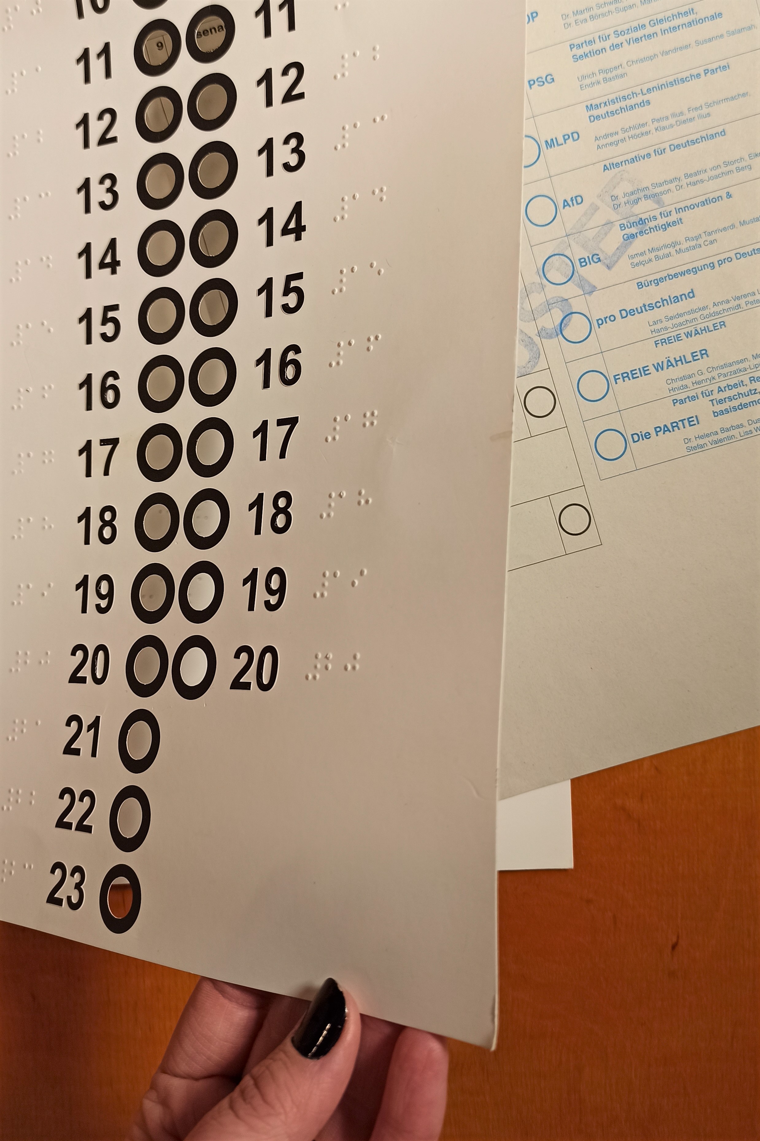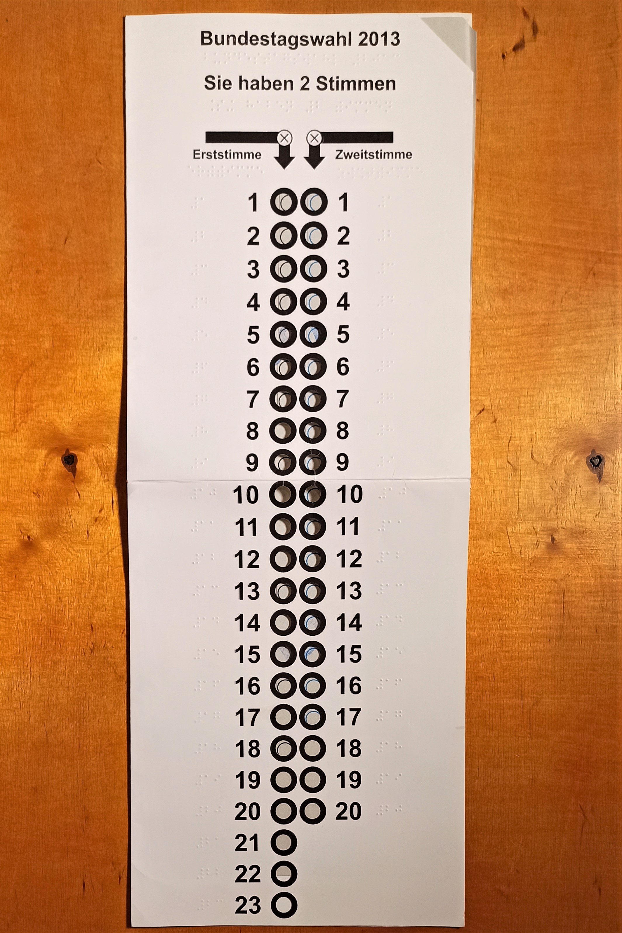 Приклад бюлетеня та трафарету зі шрифтом Брайля, які використовувались на парламентських виборах у Німеччині в 2013 році