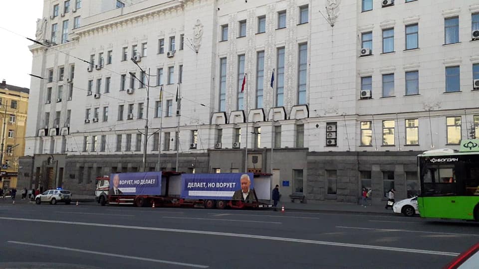 Крім того, кілька днів тому помічник нардепа Куницького Дмитро Ніконов, який у період дочасної кампанії вкладав гроші на рекламу Мустафаєвой у Facebook, організував під міськрадою акцію протесту. До будівлі міської ради приїхали дві вантажівки, на яких було зображено секретаря міськради Ігоря Терехова. Поряд з зображенням були надписи: «Ворует, но делает», «Делает, но ворует».