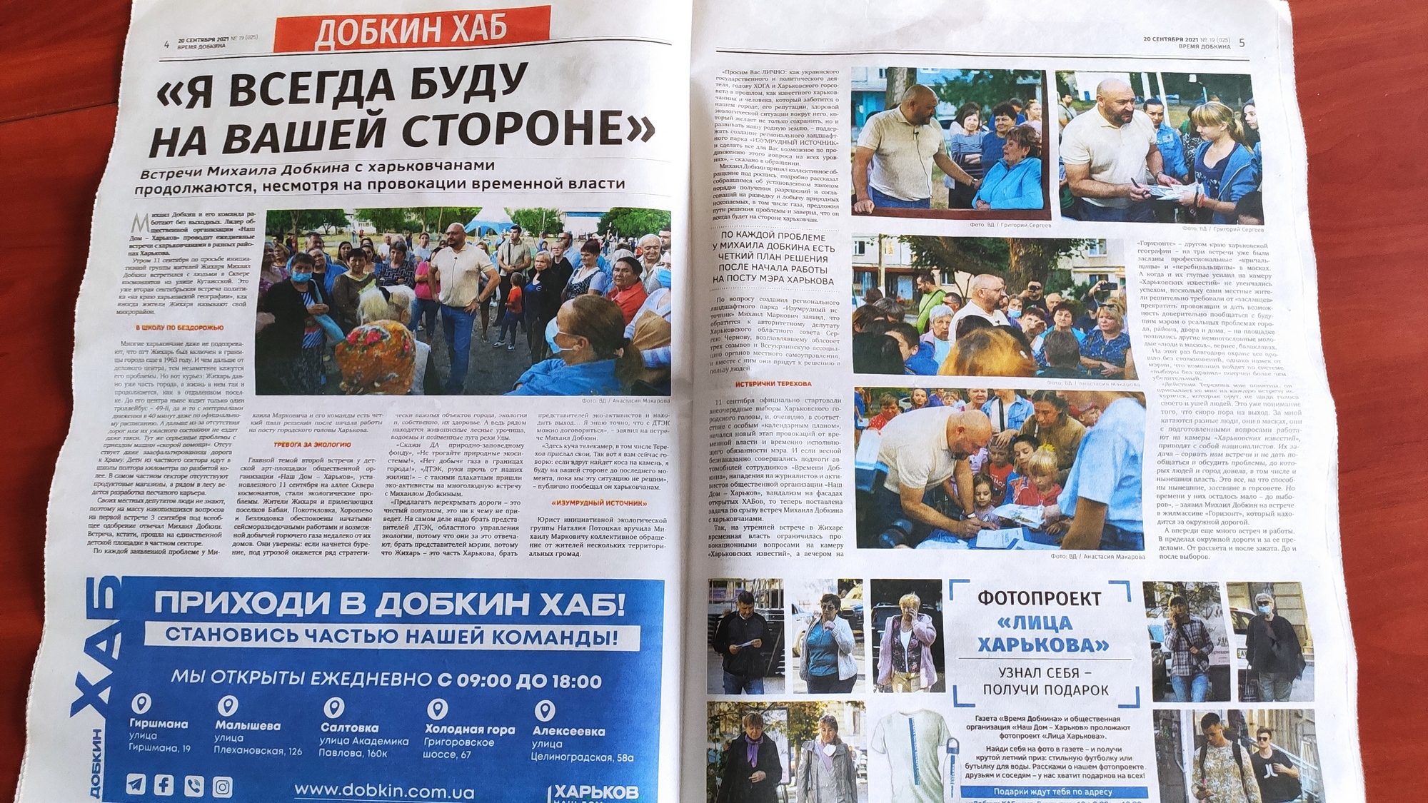 На даний час, Добкін – єдиний кандидат, на користь якого регулярно розповсюджується агітаційна газета, а також флаєри із зображенням кандидата та зазначенням адрес офісів-Добкін хабів.