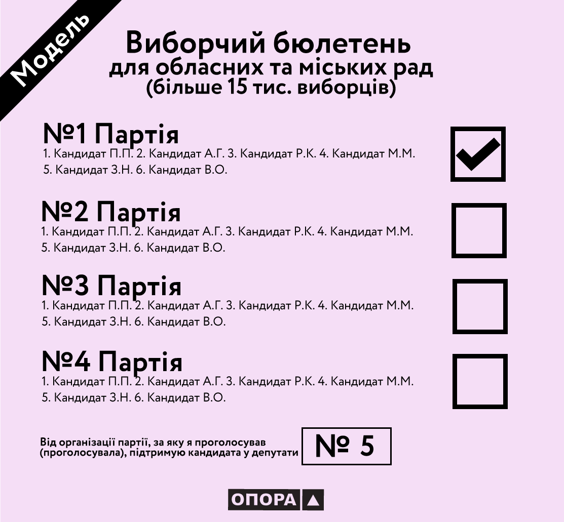 А от для голосування за депутатів міської (міста більше 15 тисяч виборців) та обласної рад виборці зможуть поставити дві позначки: за партію та за кандидата від цієї партії. Так, у бюлетені під порядковими номерами будуть розміщені назви партій, а під кожною з них із окремими порядковими номерами розташовані їхні кандидати. А вже в самому низу бюлетеня після всього списку партій буде припис: "Від організації партії, за яку я проголосував (проголосувала), підтримую кандидата у депутати" та прямокутник, у якому зазначається знак "№" з вільним полем для написання номера кандидата в депутати. Якщо хтось із виборців проігнорує це голосування за кандидата або просто не побачить припис наприкінці бюлетеня, то буде зарахований лише голос за обрану партію, а от допомогти тому чи іншому кандидату просунутись у партійному списку вище не вийде.