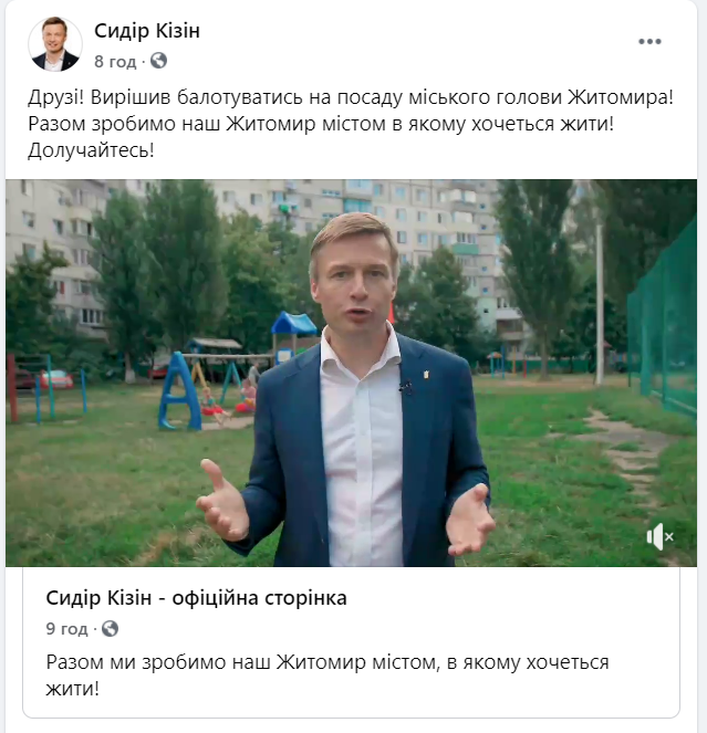 Депутат обласної ради, голова Житомирської обласної партії ВО “Свобода” Сидор Кізін 26 серпня заявив про намір балотуватись на посаду міського голови. Про це він повідомив на своїй сторінці у Facebook.