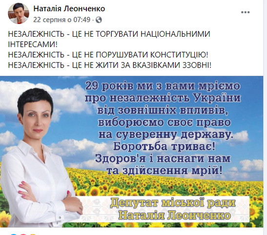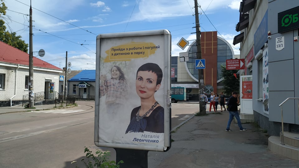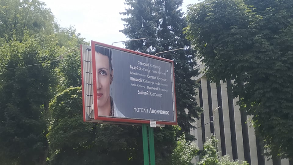 Білборди та сітілайти депутатки Житомирської міської ради і потенційної кандидатки в мери Наталії Леонченко почали з'являтись на вулицях міста ще навесні: це і вітання зі святами, і заклики змінювати Житомир та гуляти з дітьми. Леонченко - голова міської організації партії “Опозиційний блок - За життя”.