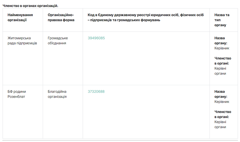 У щорічній декларації Олени Розенблат за 2019 рік зазначено, що вона є членом “Благодійного Фонду родини Розенблат” та громадського об’єднання “Житомирська рада підприємців”.