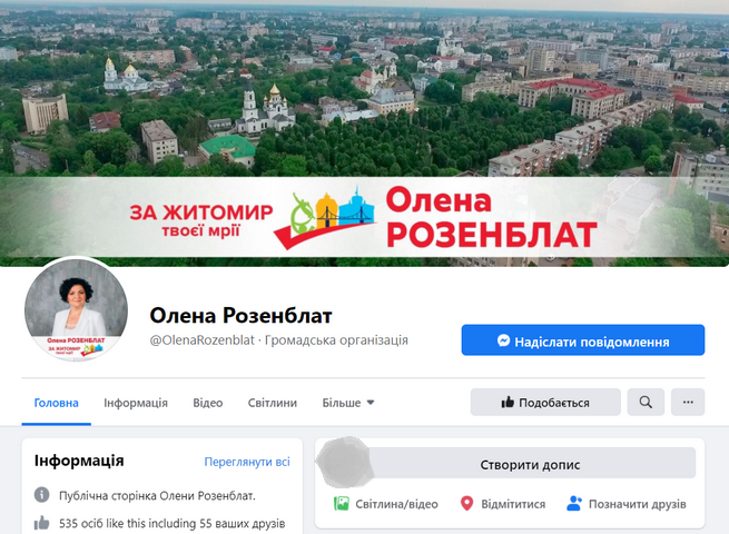 На сторінці опубліковані відеозвернення потенційної кандидатки, інформація про проєкт реконструкції набережної у Житомирі, яким керує Олена Розенблат, як представниця підрядної організації. Також вітання з державними святами. На основній світлині сторінки - логотип на та напис “За Житомир твоєї мрії”.