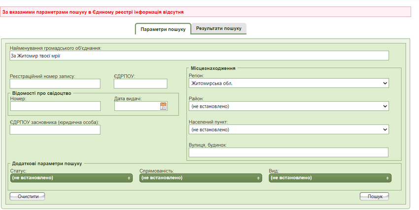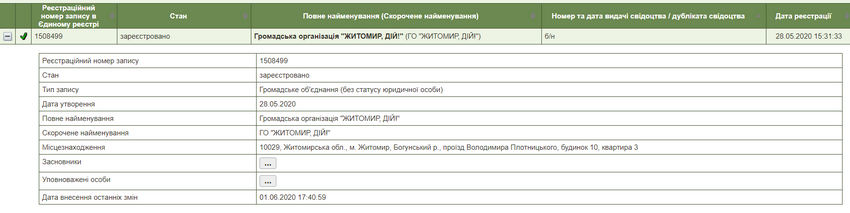 У реєстрі громадських об'єднань станом на 27 серпня інформація про зареєстровану ГО з такою назвою відсутня.