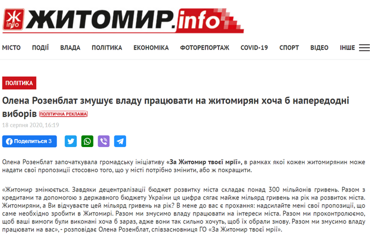 На сайті Житомир.infо під маркуванням “політична реклама” 18 серпня опублікували матеріал з назвою “Олена Розенблат змушує владу працювати на житомирян хоча б напередодні виборів”. У першому реченні новини зазначено: “Олена Розенблат започаткувала громадську ініціативу «За Житомир твоєї мрії», в рамках якої кожен житомирянин може надати свої пропозиції стосовно того, що у місті потрібно змінити, або ж покращити.”