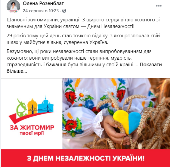 Тут Розенблат називає себе: ”співзасновниця ГО ”За Житомир твоєї мрії”. Також в матеріалі зазначено, що у громадської ініціативи ”За Житомир твоєї мрії” є сторінка в Фейсбуці, де житомиряни зможуть ділитися своїми ідеями. За посиланням - публічна сторінка Олени Розенблат, яка в мережі має статус громадської організації.