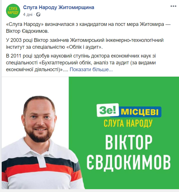 У Житомирі партія “Слуга народу” на своїй сторінці у Facebook офіційно повідомила, що від партії в мери балотуватиметься ректор університету “Житомирська політехніка” Віктор Євдокимов. У лютому 2020 року у ЗМІ була інформація, що він очолив обласну організацію партії “Наш край”. До 2018 року він був кліриком Свято-Анастасіївського жіночого монастиря, де і проводив служби.