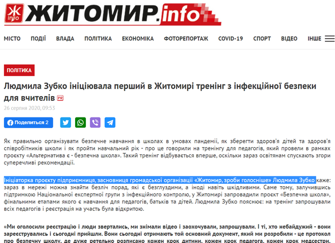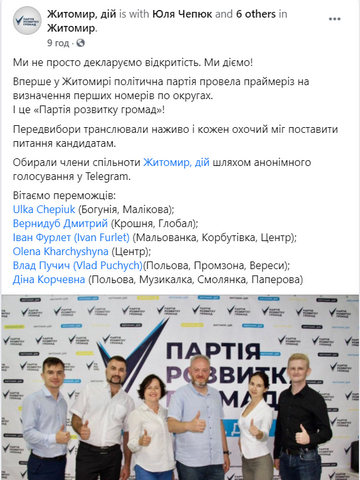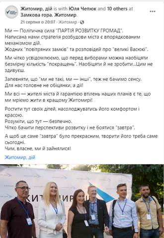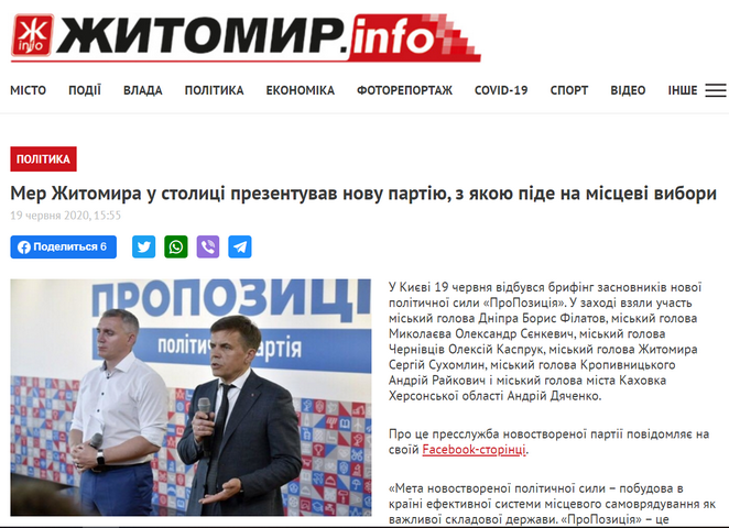На місцевому сайті Житомир.info 19 червня 2020 року з'явилась публікація під заголовком: «Мер Житомира у столиці презентував нову партію, з якою піде на місцеві вибори».