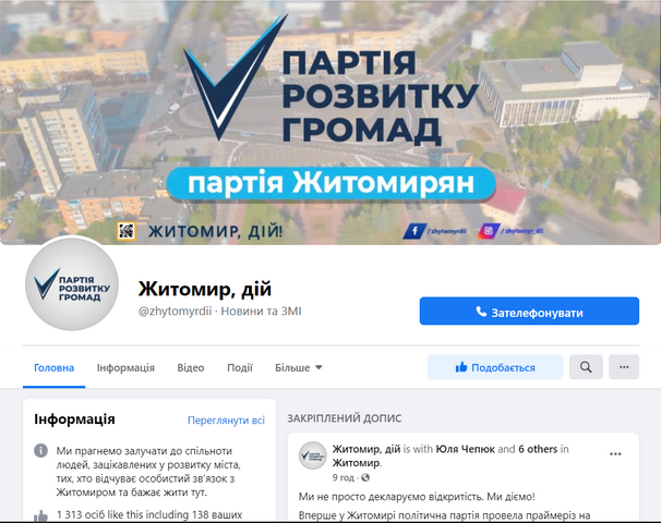 20 липня 2020 року у мережі Facebook була створена сторінка спільноти під назвою “Житомир, дій”. На сторінці публікуються відеосюжети за участі Матвія Хренова, в яких він розповідає про Житомир і які зміни тут потрібні. У титрах зазначено, що Матвій Хренов – голова громадської організації “Житомир дій”. Також тут розміщена інформація про команду партії, оголошення про заходи, круглі столи, стратегічні сесії і зустрічі, відео та фото з презентації партії “Партія розвитку громад”, такий же напис і на основній світлині спільноти. Тут наживо транслювали праймеріз кандидатів у депутати міської ради.