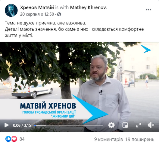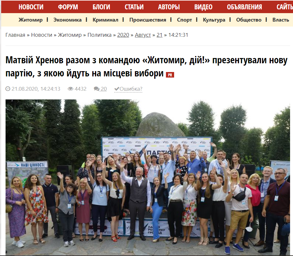 На сайті Журнал Житомира 21 серпня розмістили публікацію під заголовком: “Матвій Хренов разом з командою «Житомир, дій!» презентували нову партію, з якою йдуть на місцеві вибори”.