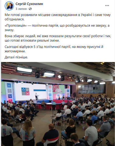 На своїй сторінці у Facebook 3 липня Сухомлин опублікував допис про участь з'їзді партії.
