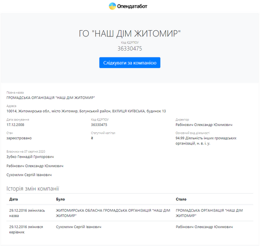 У реєстрі громадських об'єднань зазначено, що ГО “Житомир, зроби голосніше” заснована 12 серпня 2018 року. Спрямованість - соціально-економічний та культурний розвиток. Головою правління є Людмила Зубко.