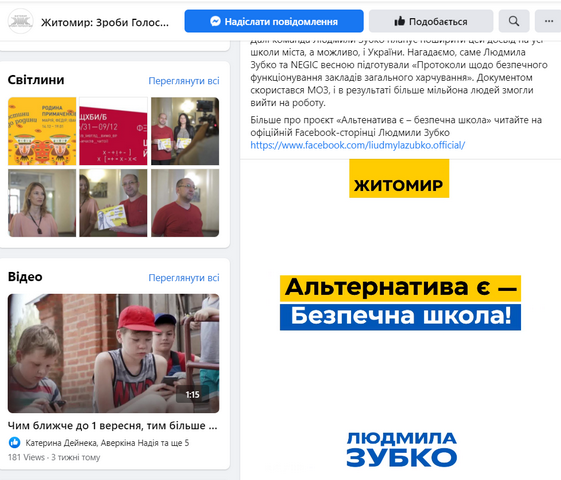 Потенційною кандидаткою в мери є Людмила Зубко, дружина колишнього віцепрем'єра Геннадія Зубка. На білбордах та у ЗМІ Людмила Зубко популяризує ініційований нею проєкт “Альтернатива є – безпечна школа” щодо організації навчального процесу в умовах карантину. Кольорова гама плакатів схожа на рекламу партії “Блок Петра Порошенка “Солідарність”. У ЗМІ активно з'являються публікації під маркуванням “політична реклама” про ініціативи Зубко. Поки що вона називає себе: “Ініціаторка проекту “Альтернатива є – безпечна школа”, підприємниця, засновниця громадської організації “Житомир, зроби голосніше” Людмила Зубко”.