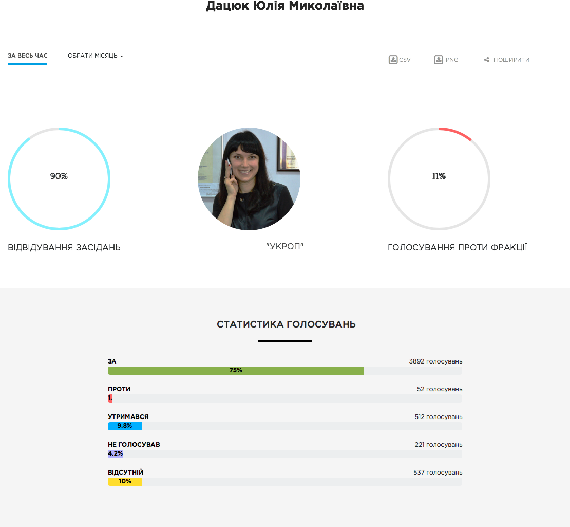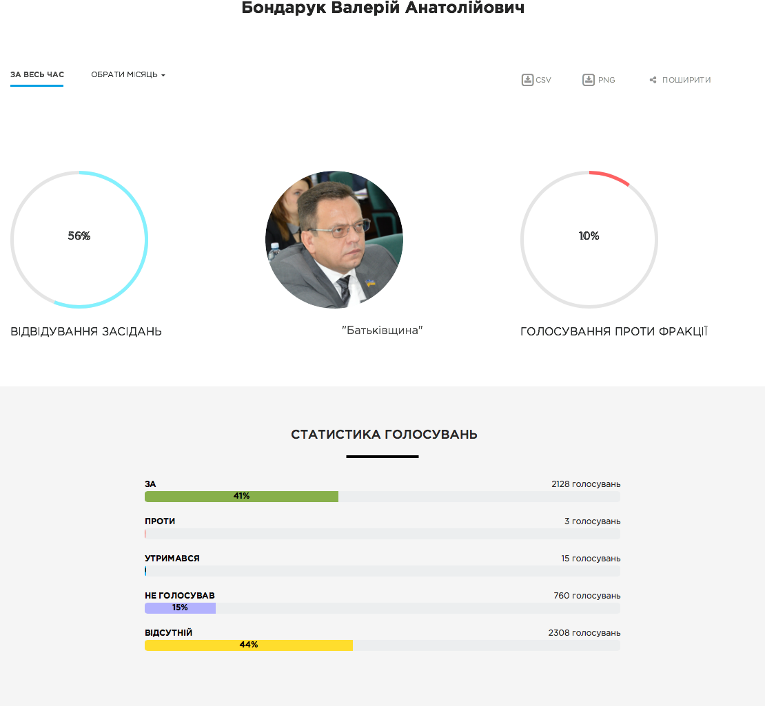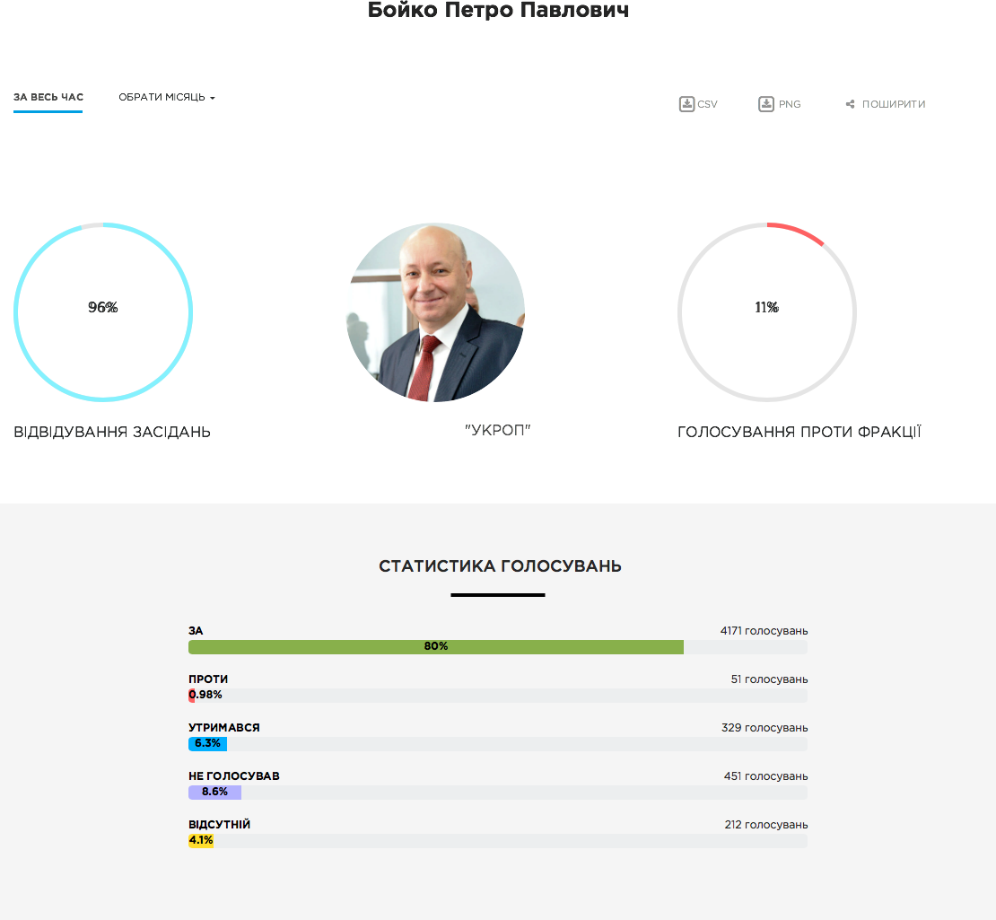 Скориставшись інструментом «Вони голосують для тебе» за досить короткий проміжок часу дізнаємось, що депутат Петро Бойко з фракції «Українського об’єднання патріотів» є представником ради, який з-поміж усіх своїх колег по депутатському корпусу підтримав найбільшу кількість проектів рішень, що розглядались на сесіях – 80%. Натомість, депутат, що входить у фракцію «БПП «Солідарність» найменше разів натискав у сесійній залі кнопку «За» і, таким чином, підтримав лише 29% від усіх проектів рішень.