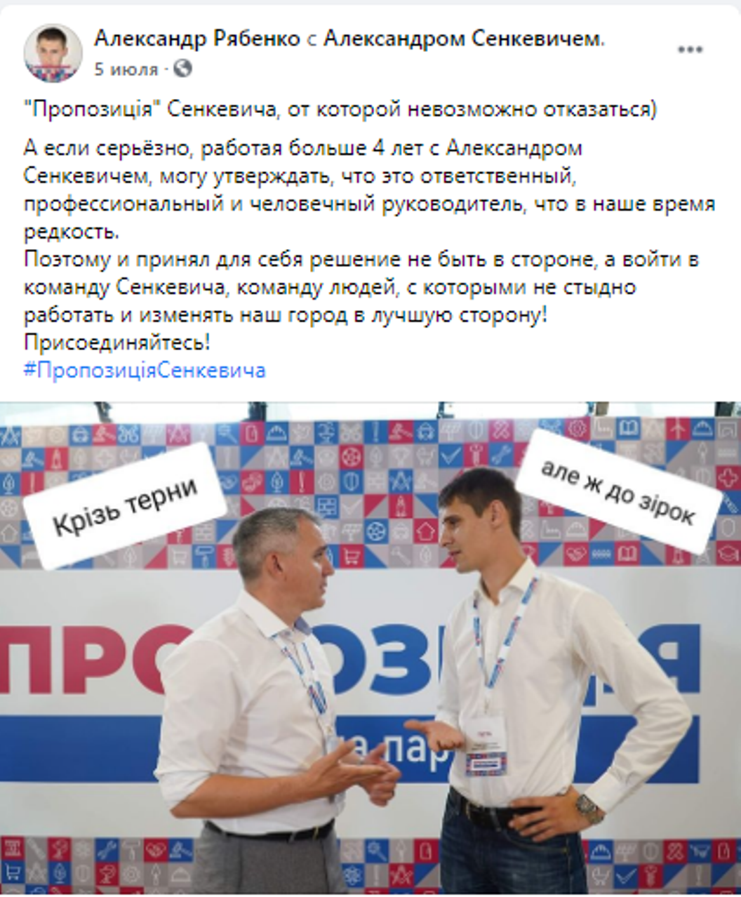 А начальник управління молодіжної політики Миколаївської міської ради Олександр Рябенко протягом серпня на своїй сторінці у Фейсбук демонструє власну прихильність до політичної партії «Пропозиція». Дані дії теж можуть мати ознаки порушення статті 40 Закону України «Про запобігання корупції».
