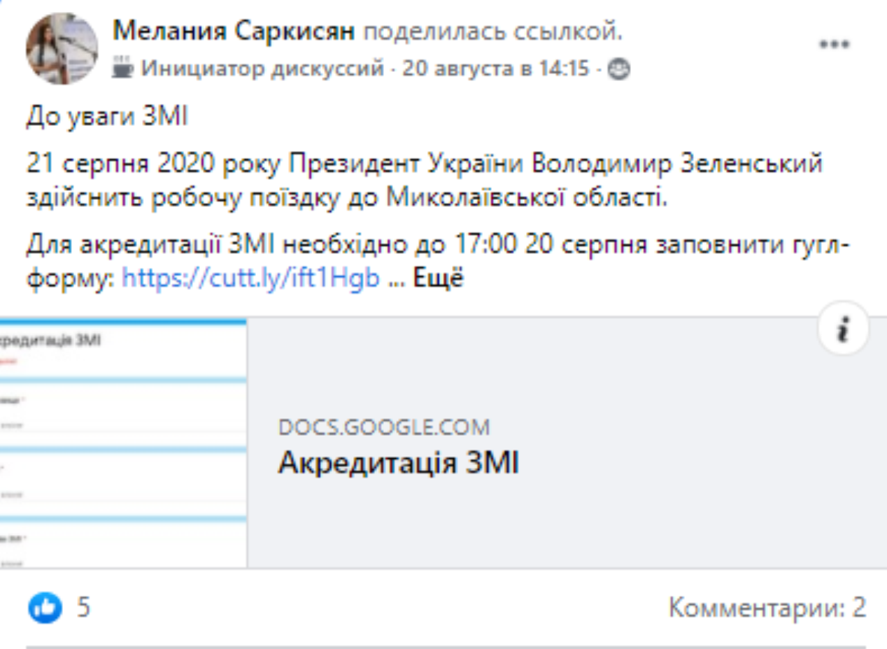 Меланія Саркісян, головний спеціаліст відділу аналізу суспільно-політичних процесів та комунікацій з громадськістю управління інформаційної діяльності та комунікацій з громадськістю Миколаївської обласної державної адміністрації, була долучена до інформаційного супроводу політичного заходу партії «Слуга народу». Так, вона проводила акредитацію представників ЗМІ на візит Президента України Володимира Зеленського до Миколаєва, в тому числі на захід на «8 причалі», де під час презентації Стратегії розвитку Миколаївської області було представлено місцевих потенційних кандидатів від партії «Слуга народу». Локація, на якій відбулася зустріч, була оформлена в кольори та символіку політичної партії «Слуга народу». Згодом Меланія Саркісян розповсюджувала фото з візиту Президента, зокрема з заходу, де представляли майбутніх кандидатів.