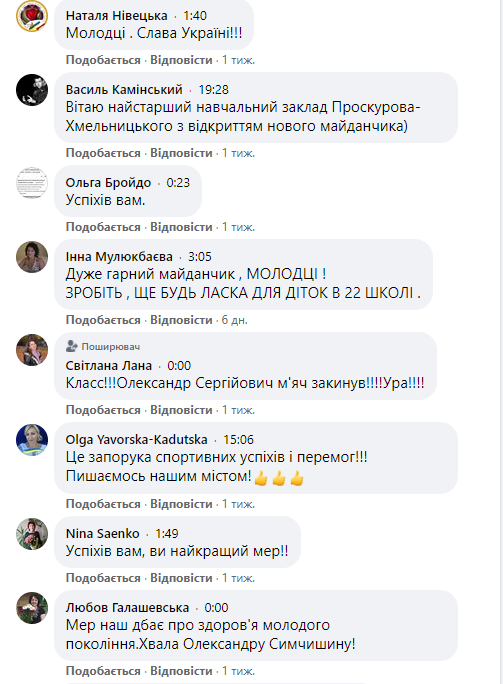 Схожа ситуація і з постами на сторінці «Команда_Симчишина», яка хоч і зазначає себе в соцмережі як громадську організацію (і така громадська організація з 30.07.2020 року справді існує), проте фактично є також і сторінкою партії з аналогічною назвою – «Команда Симчишина», позаяк тут є інформація про партійний з’їзд та запрошення долучатися до команди. На сторінці, зокрема, транслюють заходи з нагоди відкриття спортивних майданчиків у навчальних закладах міста, повідомляють про будівництво велодоріжок в Хмельницькому. Часто аналогічні відомості подає й сторінка Хмельницької міської ради. Як і в попередньому випадку, під дописами на сторінці «Команда_Симчишина» можемо читати вдячні коментарі.