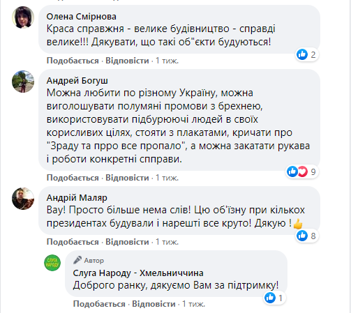 - про ремонт дороги державного значення на Красилівщині (закінчують допис словами «Працюємо далі!) та будівництво мультифункціонального спортивного майданчика за 1,6 млн грн у Волочиську (про цей проєкт розповідають і на Facebook-сторінці Хмельницької ОДА) в межах програми «Велике будівництво»;