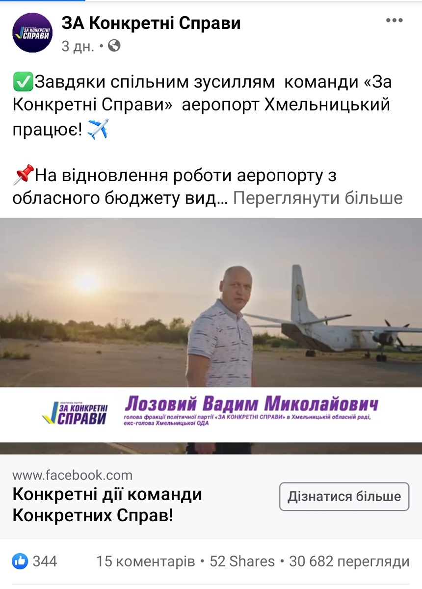 На сторінках у Facebook, пов’язаних з партійними організаціями, що діють на Хмельниччині, публікують дописи про досягнення органів місцевого самоврядування та державної влади. «Привласнюючи» у такий спосіб проєкти, реалізовані за кошти з місцевого чи державного бюджетів, партії маніпулюють інформацією та створюють собі позитивний імідж напередодні місцевих виборів.