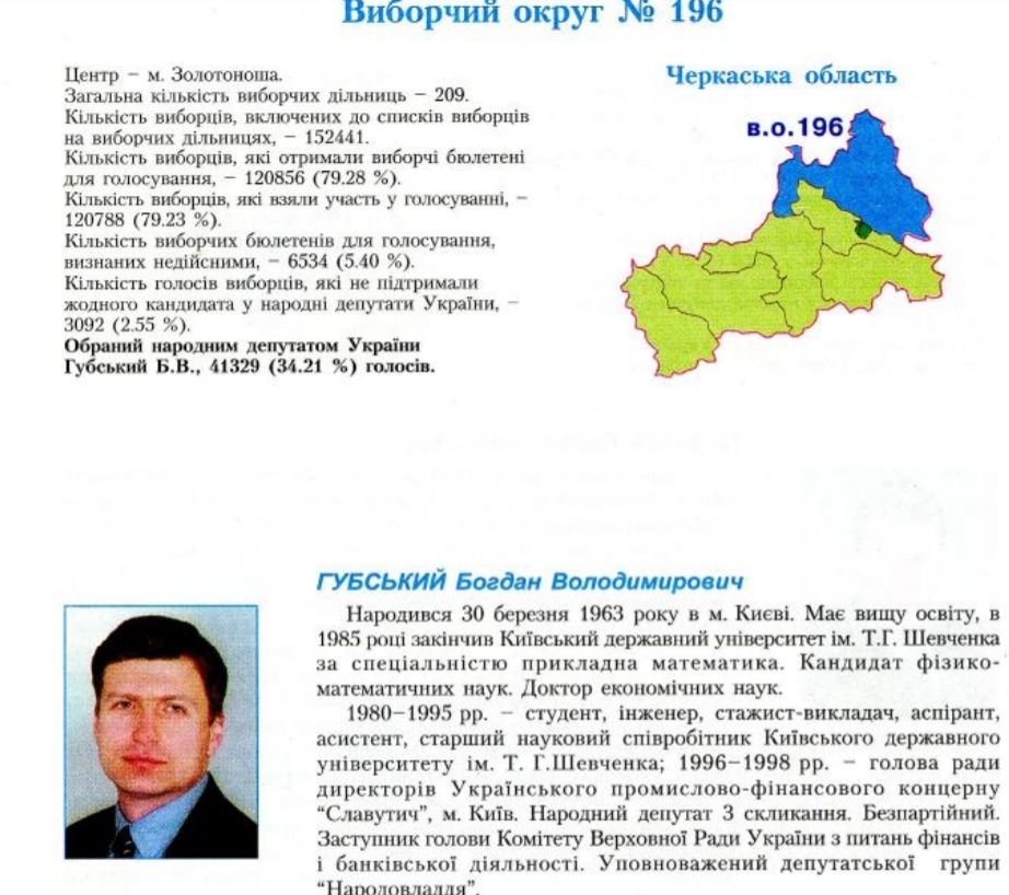 На окрузі №196 (Золотоноша) перемогу святкував Богдан Губський. Він здобув 34,21% голосів виборців. У Верховній раді він п’ять разів змінював фракцію. Останньою була фракція «Блоку Юлії Тимошенко».