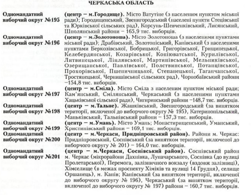 Територія Черкаської області була поділена на сім виборчих округів (195-201). Окружні виборчі комісії утворили на території області 1089 дільничних виборчих комісій.