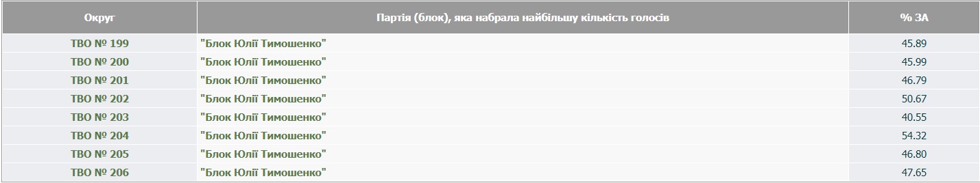 На Черкащині перемогу на всіх округах святкував «Блок Юлії Тимошенко». Найкращий результат був здобутий на окрузі №204 (центр – місто Тальне) – 44,01%. Загалом по області БЮТ отримав народну підтримку в 38,25%.