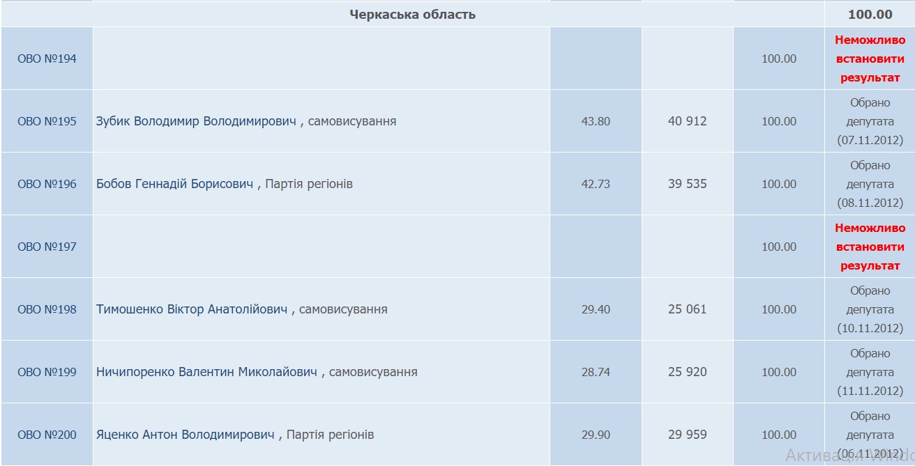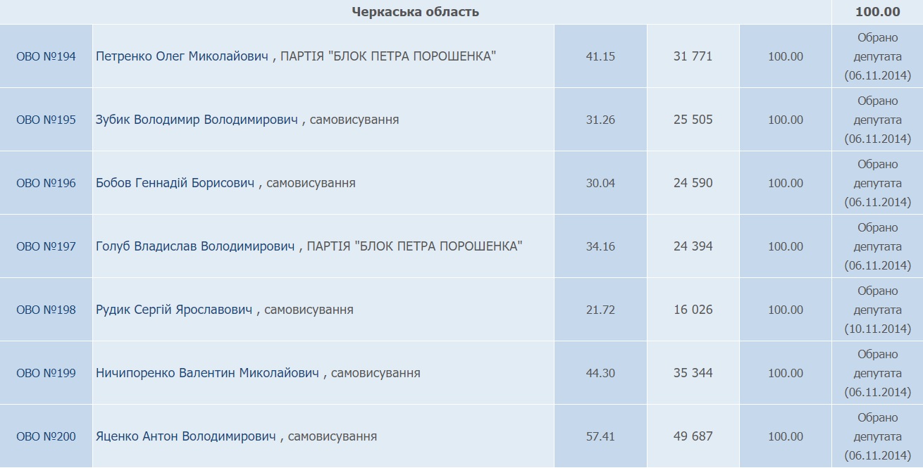 Результати були встановлені лише на п’яти із семи округів Черкаської області, ще на двох Центральна виборча комісія призначив перевибори.