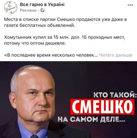Поряд із цим, не обійшлося і без випадків «чорного піару». У регіональному сегменті у зазначений період він сконцентрувався на постатях Юлії Тимошенко («Зашкварчик от Юли», який масово поширюється сторінкою іншого «потенційного висуванця» - «Команди Шарія») та Ігоря Смешка (паблік «Все гарно в Україні», публікація «Кто такой Смешко на самом деле», а також сторінка «НеДобрый вечер», матеріали обговорення «корупційної команди Хомутинника-Януковича» у першій десятці партії «Сила і честь»).