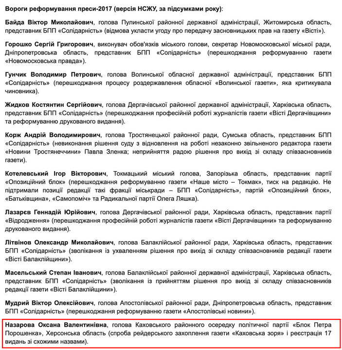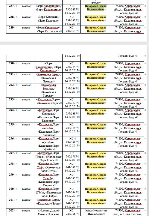 Сергій Хлань зареєстрував довіреною особою свою помічницю за строковим трудовим договором на постійній основі Валентину Комар та достатньо активну і в бізнесі, і в політичній сфері Оксану Назарову, яка не тільки достатньо тривалий час займалась партійним будівництвом Блоку Петра Порошенка «Солідарність», але і стала ворогом преси у 2017 та 2019 роках за версією НСЖУ. Вона отримала це відзначення за тривалий конфлікт з редакцією районної газети «Каховська зоря». Водночас за даними управління юстиції вона має стосунок до більше 15 ЗМІ, у назві яких є слова «каховка» + «зоря/зірка».