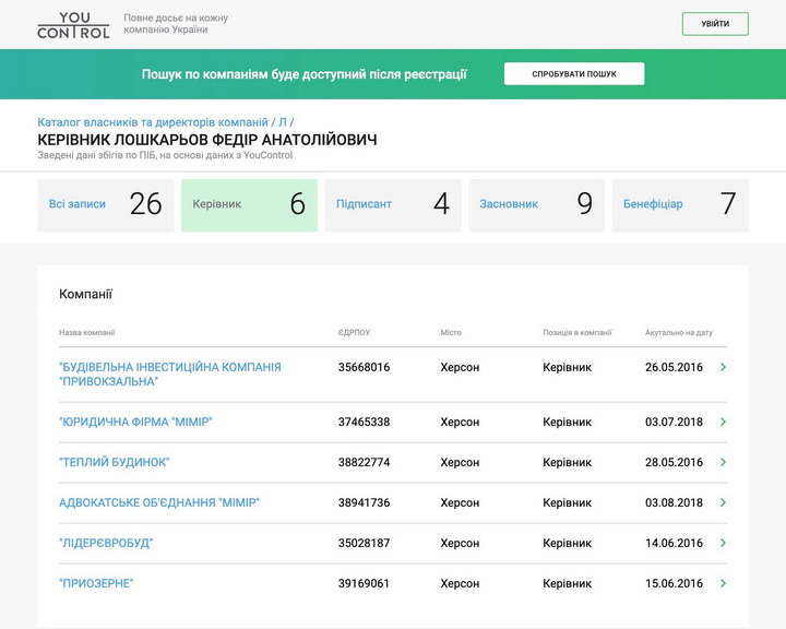 Так само на території 183-го округу лише 1 кандидат зареєстрував своїх довірених осіб – Валерій Кулешов подав кандидатури Федора Лошкарьова, Світлани Мазуряк та Андрія Полякова. У відкритих джерелах більше всього інформації про Федора Лошкарьова. Він очолює не тільки юридичну фірму «МІМІР», вказану на сайті ЦВК, але і керує бізнесом у сфері будівництва та очолює сільськогосподарський кооператив.