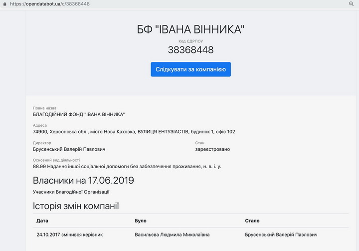 Фонд продовжує знаходитись за тією самою адресою, як і її основний бізнес. Окрім того, Дмитро Васильєв та Людмила Васильєва працювали помічниками народного депутата Вінника, а зараз місцем їх роботи задекларований ТОВ Рубін-2017, так само, як і місце роботи довіреної особи Івана Вінника – Олени Красовської.