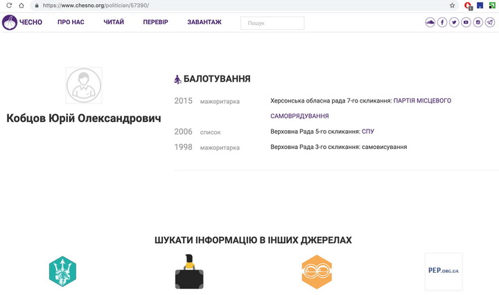 Друга довірена особа кандидата доволі активно брала участь у політичному житті регіону. На сайті однойменного з прізвищем кандидата благодійного фонду Юрій Кобцов значиться як представник Новокаховського відділення благодійного фонду. Водночас він активно долучався до місцевих та національних виборів у якості кандидата, переважно від Соціалістичної партії. Так, у 1998 році був само висуванцем на виборах до Парламенту, у 2006 році вже пішов у списку Соціалістичної партії України, також до Парламенту. У 2015 році спробував потрапити до Херсонської обласної ради, але вже через Партію місцевого самоврядування. У реєстрах Юрій Кобцов продовжує значитись як засновник обласного відділення СПУ.