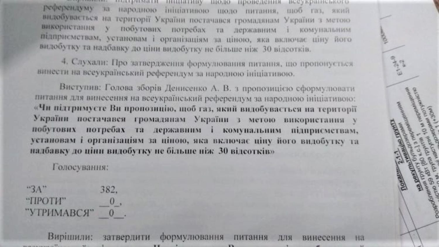 В селищі Петриківка нам вдалося поспілкуватись з одним із організаторів зборів Ігорем Юхименком, який є директором комунального підприємства «Безпека і благоустрій» Петриківської селищної ради. Він повідомив, що на зборах були присутніми і, відповідно, зареєстровані 382 особи. З них 65 людей були обрані членами ініціативної групи (всі вони є членами лише Петриківської громади). Вони затвердили наступне питання на всеукраїнський референдум: «Чи підтримуєте Ви пропозицію, щоби газ, який видобувається на території України, постачався громадянам України з метою використання у побутових потребах та державним і комунальним підприємствам, установам і організаціям за ціною, яка включає ціну його видобутку та надбавку до ціни видобутку не більше, ніж 30 відсотків?».
