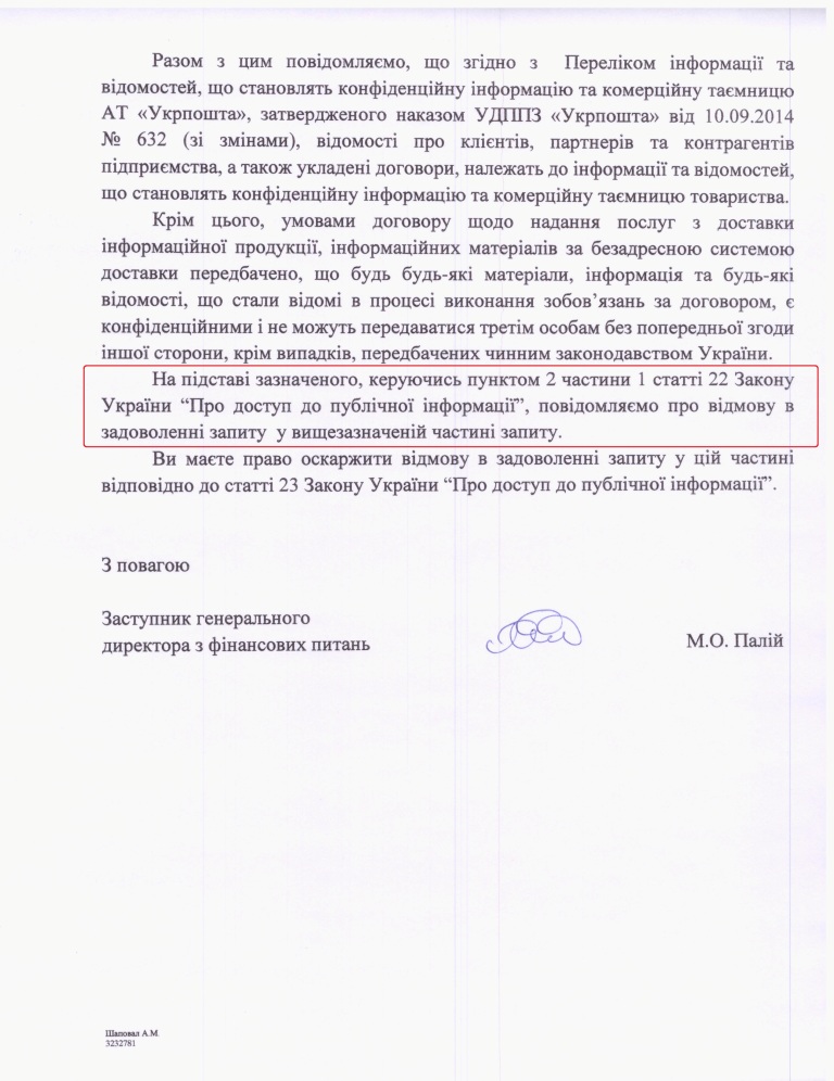 А от щодо п. 3 (скільки коштів було витрачено на поширення поштою даного спецвипуску) «Укрпошта», посилаючись на «конфіденційність інформації» та «комерційну таємницю», повідомила про відмову у задоволенні запиту у вищезазначеній частині.