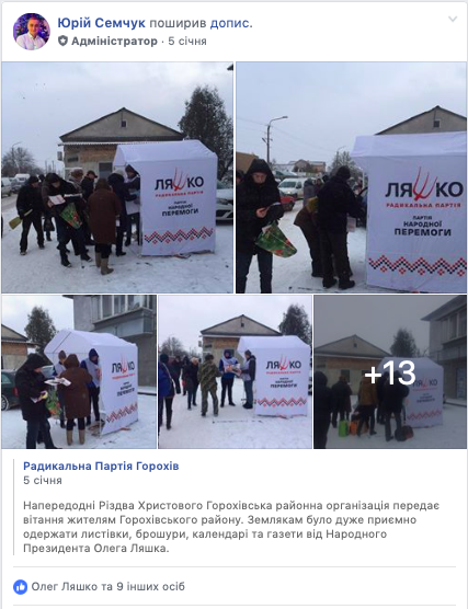 Одна з політичних сил активізувала роботу наметів лише у районних центрах. Так, на користь кандидата Олега Ляшка агітаційні намети з символікою Радикальної партії Олега Ляшка виявлено за цей же період у містах Володимир-Волинський, Камінь-Каширський, Горохів і Любомль, а також у смт Любешів.
