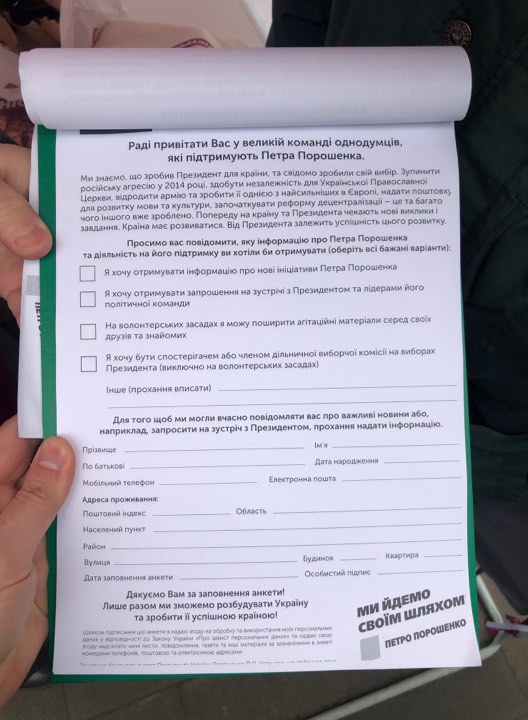 Далі у анкеті йшлося: «Для того, щоб ми могли вчасно повідомляти вас про важливі новини або, наприклад, запросити на зустріч з Президентом, прохання надати інформацію: прізвище, ім’я, по батькові, дату народження, мобільний телефон, електронну пошту, поштовий індекс, область, населений пункт, район. Вулицю, будинок, квартиру, а також поставити особистий підпис».