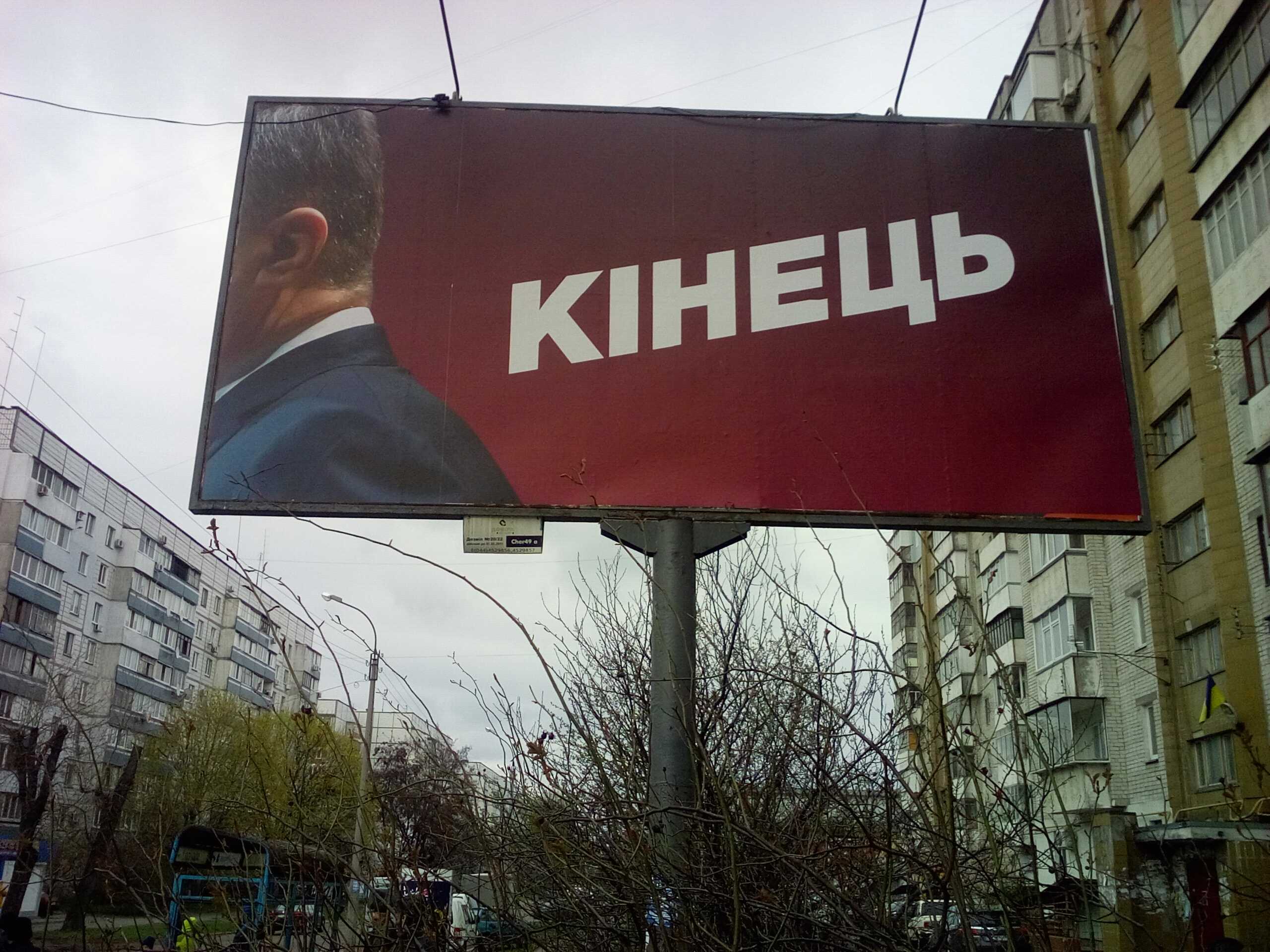 На вихідних у Черкасах з’явилися білборди із силуетом Петра Порошенка, кольоровою символікою, притаманною для його виборчої кампанії, та написом «кінець». Як виявилося, такі борди були розміщені в різних містах країни.