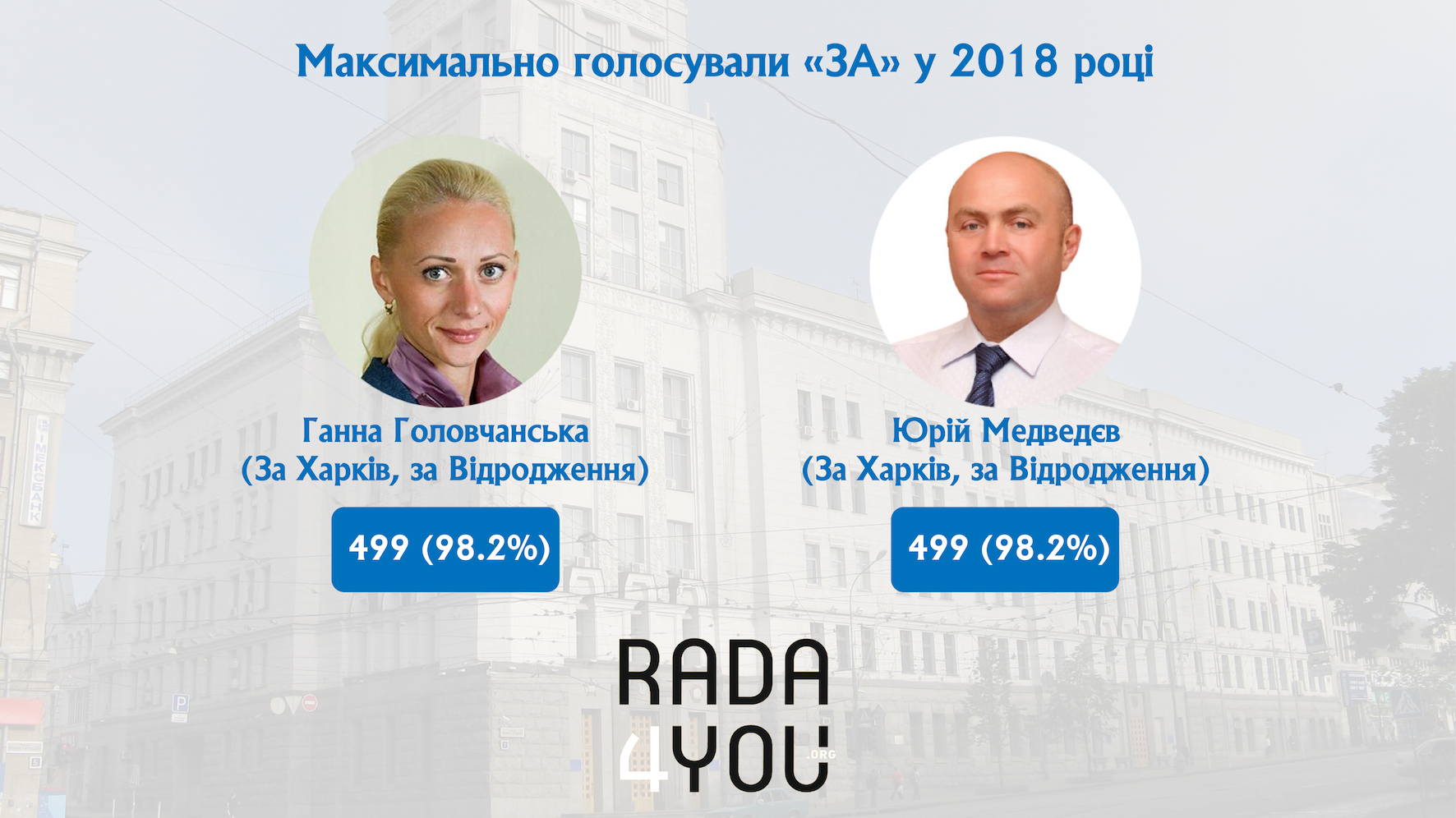 Депутатка Ганна Головчанська та депутат Юрій Медведєв (фракція «За Харків, за Відродження») більше за всіх голосували «за» у 2018 році: 499 разів з 508 голосувань. Загалом 47 депутатів та депутаток голосували «за» більше, ніж 400 разів, що складає близько 80% голосувань. Більшість з них, 43 депутати, — представники фракції «За Харків, за Відродження» та по два представники від «Нашого краю», Віктор Ларченко та Ігор Овечкін, та «Солідарності» — Ігор Романенко та Ірина Цветкова.