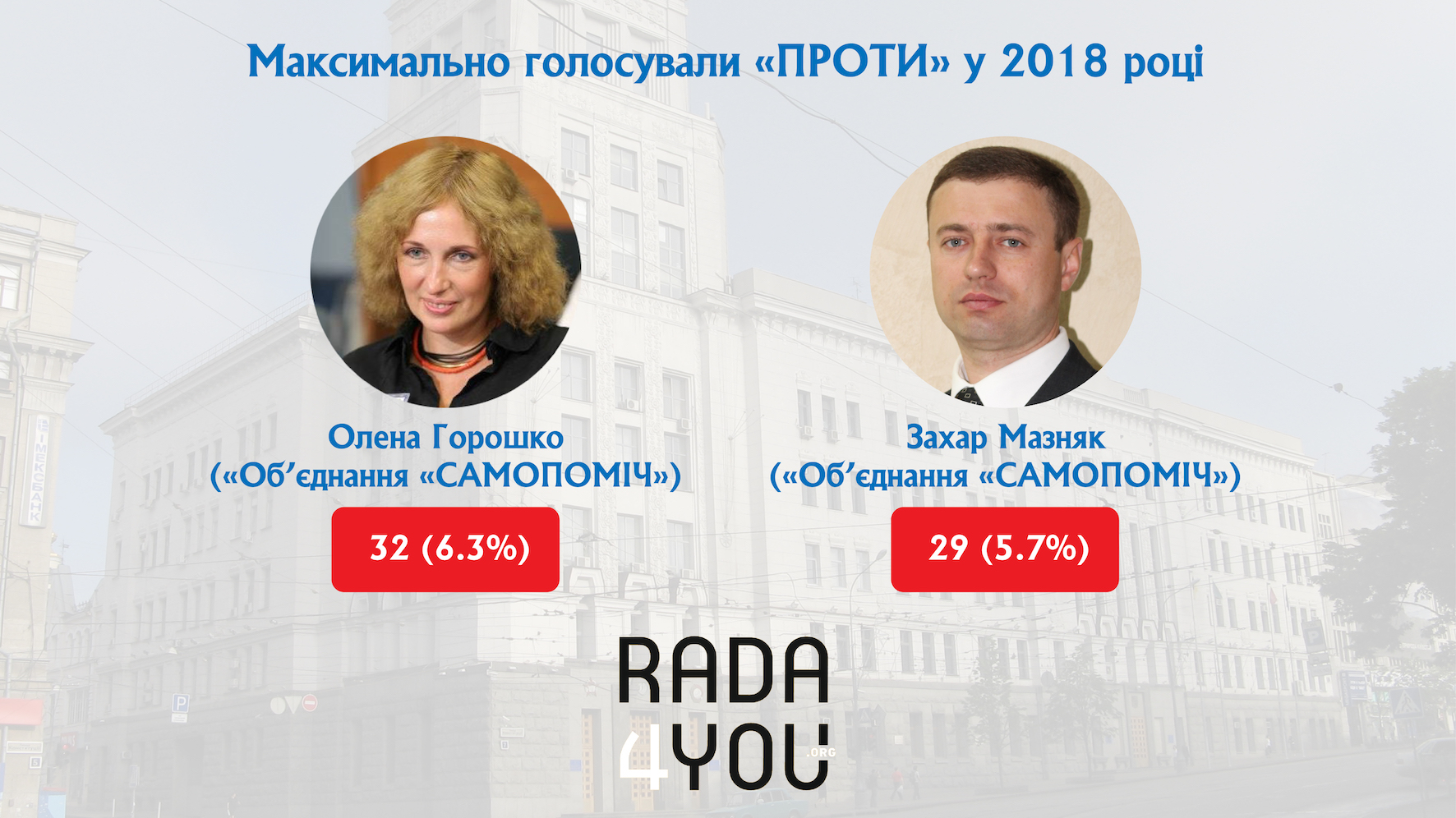 Депутатка Олена Горошко та депутат Захар Мазняк (фракція «Об’єднання «Самопоміч») найбільше голосували «проти» — 32 та 29 голосувань відповідно. Ще 13 депутатів Харківської міської ради більше десяти разів голосували «проти» протягом року. Більшість, 12 осіб, — представники фракції «Об’єднання «Самопоміч» та представниця фракції «За Харків, за Відродження» Валентина Гура, яка голосувала «проти» 10 разів.