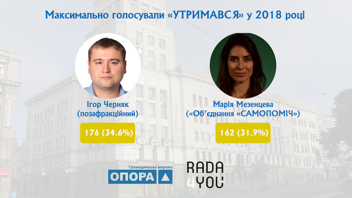У більше 100 голосувань протягом року “утримувались” 10 депутатів та депутаток. Лідерами серед таких є депутат Ігор Черняк (фракція «Об’єднання «Самопоміч») , який натискав кнопку «утримався» 176 разів та депутатка Марія Мезенцева — утрималася протягом 162 голосувань.
