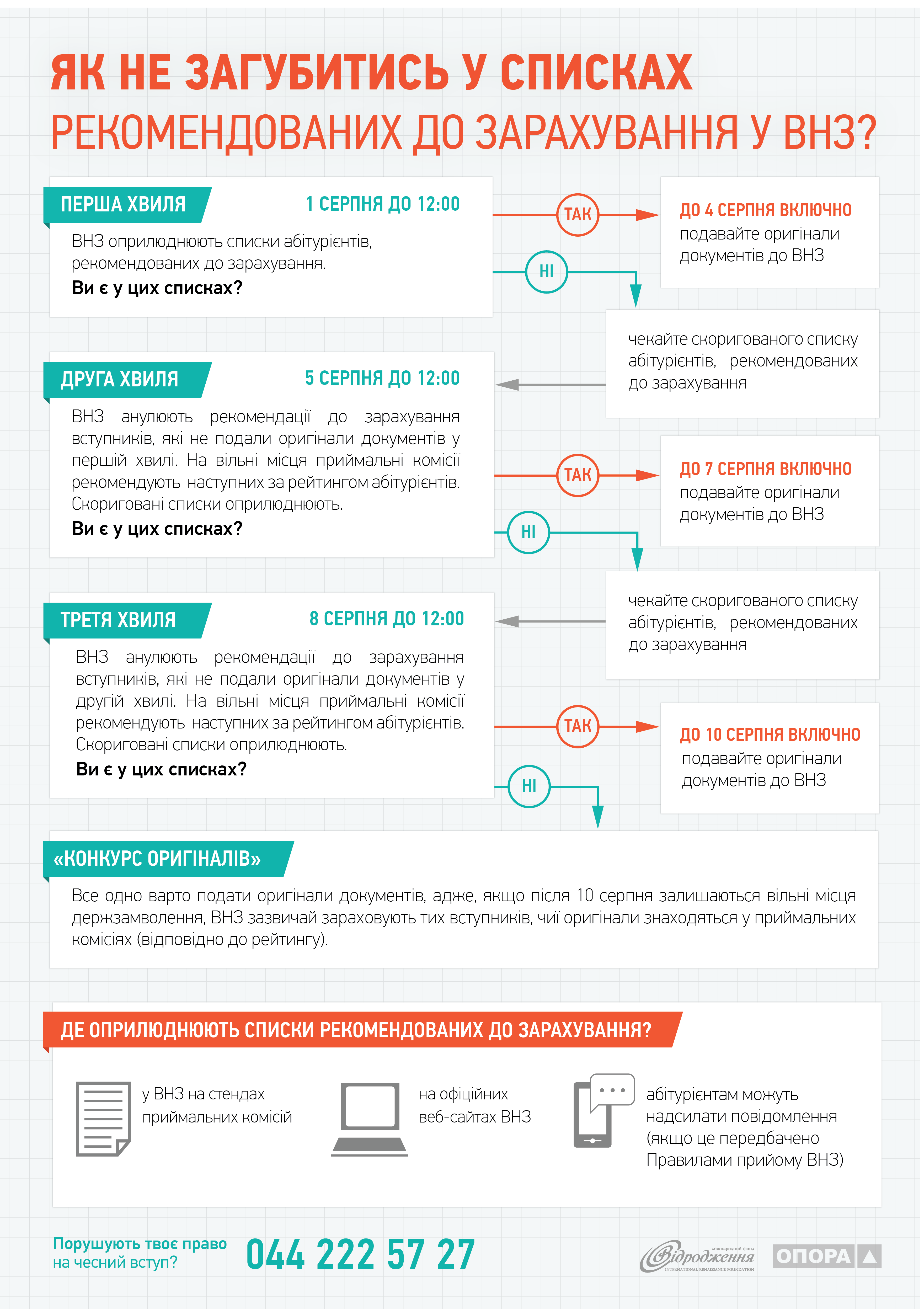 Починаючи з 11 серпня, приймальні комісії оприлюднюють списки рекомендованих до зарахування за кошт фізичних та юридичних осіб. Термін для подачі оригіналів документів для рекомендованих вступників кожен ВНЗ визначає самостійно, а тому варто слідкувати за цією інформацію у приймальній комісії. Зарахування на контрактну форму триває до 25 серпня.