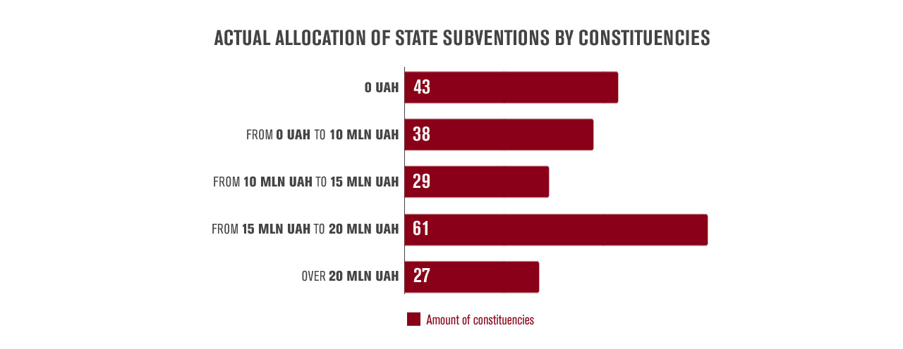 Recognizing the “significant involvement” of MP's in the process of subvention planning and allocation, we monitored how the funds were distributed among constituencies. The findings were: 27 constituencies received over 20 mln UAH, Constituency 61 received 15 to 20 mnl UAH, and 29 more constituencies received 10 - 15 mln UAH. At the same time, over 40% of the constituencies did not receive adequate state subvention. Thus, 38 constituencies received less than 10 mln UAH, and 43 constituencies did not receive anything at all. We believe it is a good evidence of uneven budget distribution and open involvement in the process.