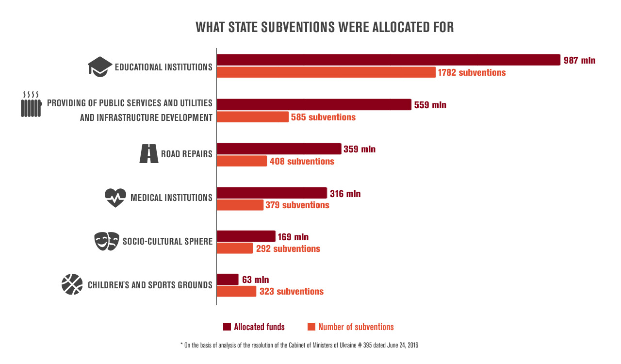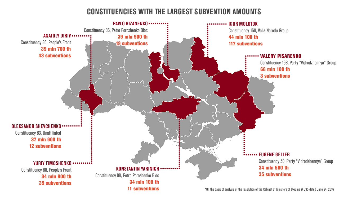 Very often MP’s boast around in social networks and in meeting with the electorate that they “brought” money to their constituency. We decided to clarify where this money comes from. In our research we came across Resolution of the Cabinet of Ministers # 395 on providing subvention in 2016 from the state budget for social and economic development of some territories, which we analyzed. Besides, we found out what MP’s actually do to solicit this money.