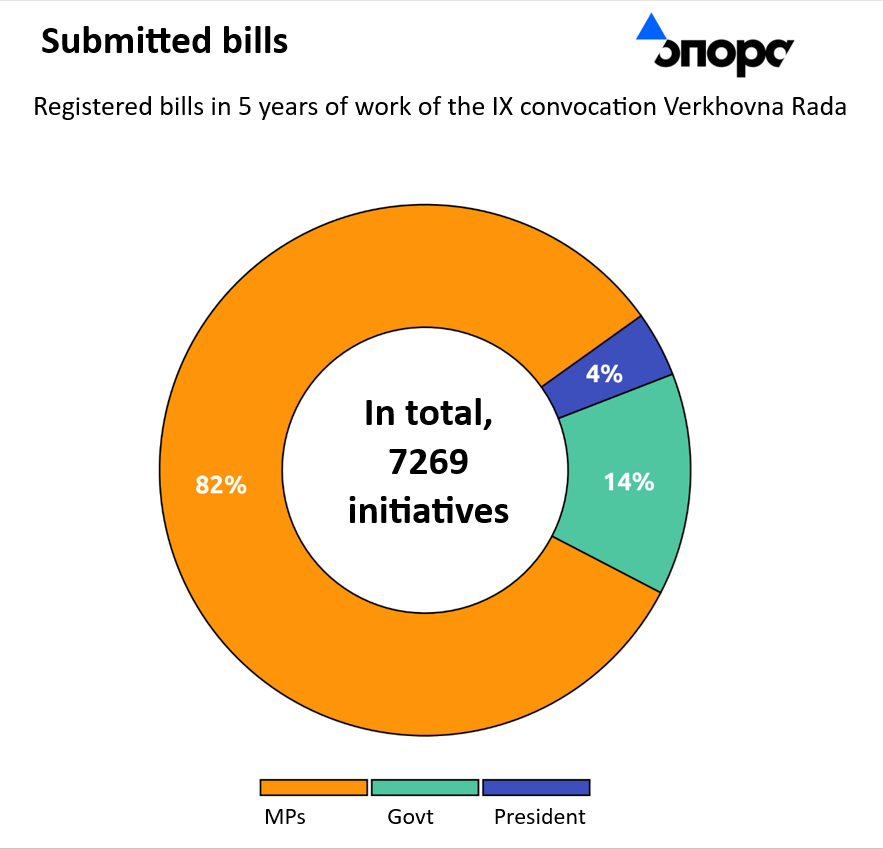 MPs registered the largest number of bills – 5,996 (82%). The Cabinet of Ministers came in second with 983 initiatives (14%), followed by the President with 290 (4%).
