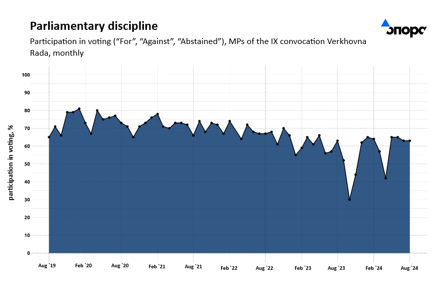 It is worth noting that a number of the most undisciplined MPs have terminated their powers for various reasons as of August 2024. Among them are Vadym Rabinovych, Andrii Derkach, Ihor Abramovych, Taras Kozak, Dmytro Shentsev, Yuliia Liovochkina, Yurii Solod etc.