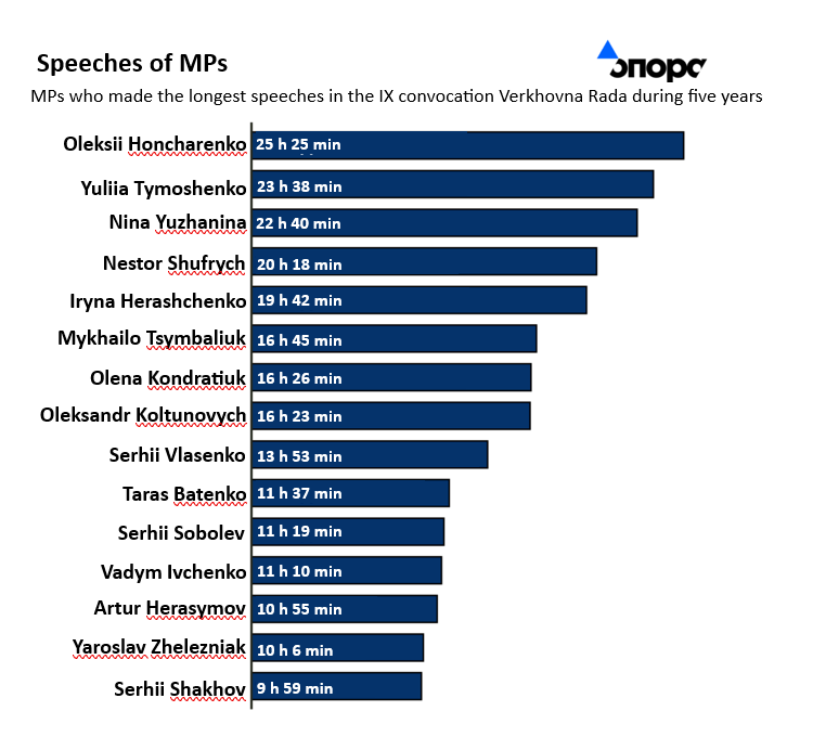 As for the duration of expressing one's opinion, the leader in this indicator is Oleksii Honcharenko (European Solidarity) – 25 hours and 25 minutes. The second place was taken by the leader of the Batkivshchyna (Fatherland) party, Yulia Tymoshenko, with 23 hours and 38 minutes. Nina Yuzhanina, a member of the European Solidarity party, came in third with 22 hours and 40 minutes.