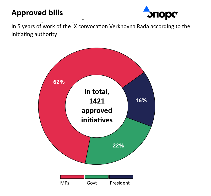 Over the five years of the Rada's work, every fifth draft law initiative successfully passed voting – 1421 out of 7269 registered. In the previous convocation, this figure was lower, as the Parliament supported only one out of eight draft laws. It is noteworthy that, compared to the previous OPORA's results (for the four years of the Parliament's work), the efficiency of the MPs of the IX convocation has not changed.